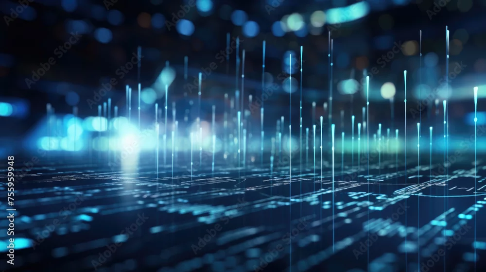 Technological Abstract Background, Perfect for Information Technology Themes, Featuring Dark Space with Streaming Code Lines and Emerging Columns of Light. ...
