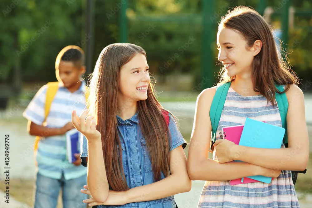 Teenagers with backpacks and notebooks on walking in the park