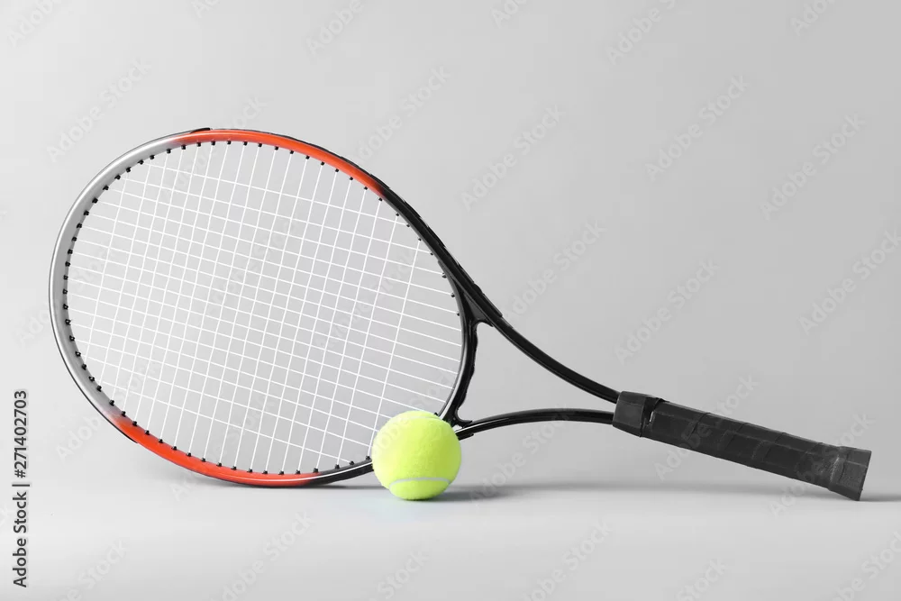 Tennis racket and ball on grey background