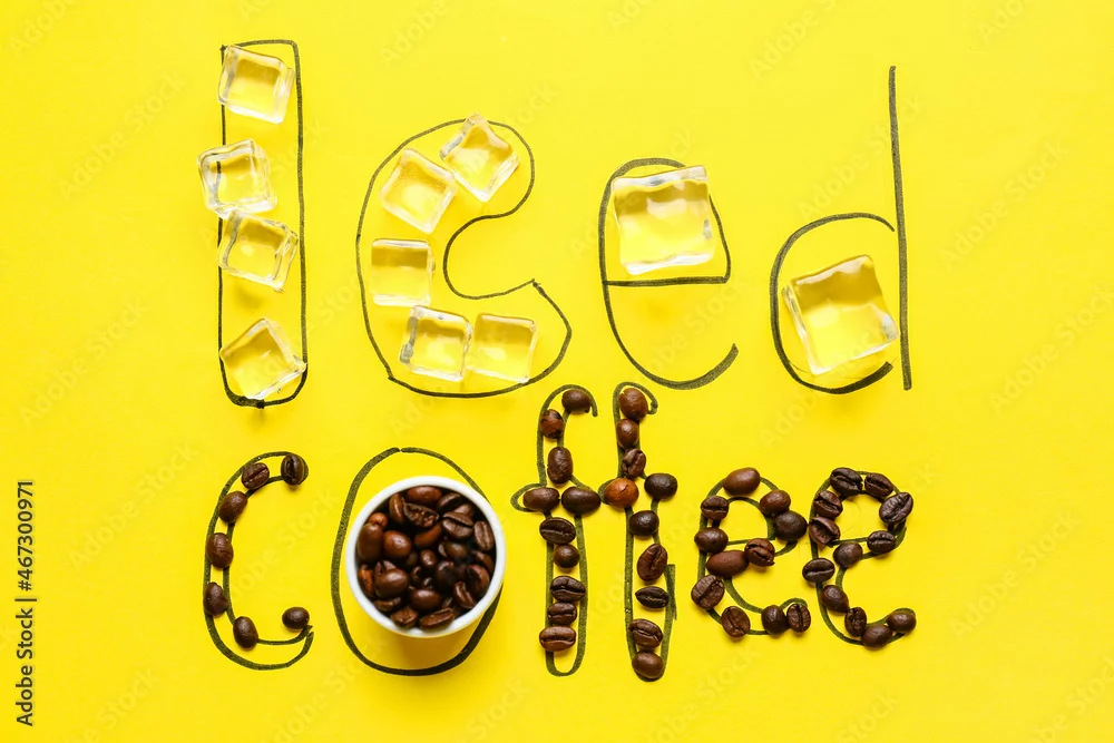 Text ICED COFFEE made of ice and beans on color background