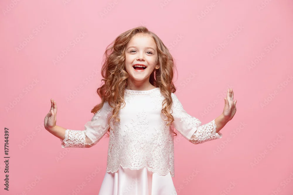 The beautiful little girl in dress standing and posing over white background
