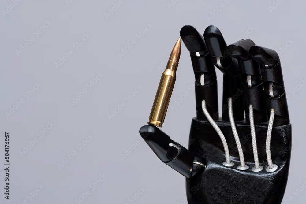 The black mechanical arm of the robot holds a cartridge with a bullet on a light background, a place for text. Concept: production of weapons, sale of ...