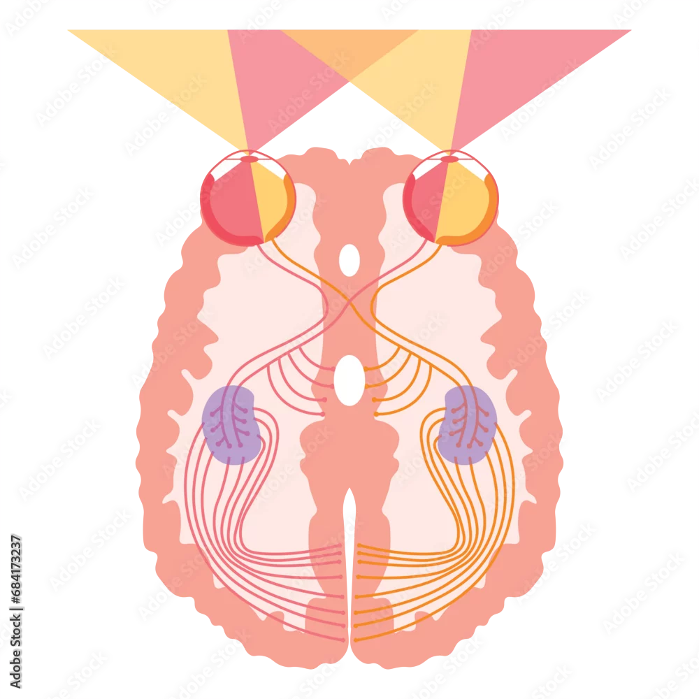 The human visual system pathway. The visual pathway from the eye to the brain. Right and left visual cortex. Binocular field. Suprachiasmatic nucleus of hypothalamus. Optic nerves. Optic chaism.