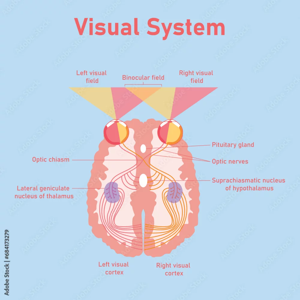 The human visual system pathway. The visual pathway from the eye to the brain. Right and left visual cortex. Binocular field. Suprachiasmatic nucleus of hypothalamus. Optic nerves. Optic chaism.