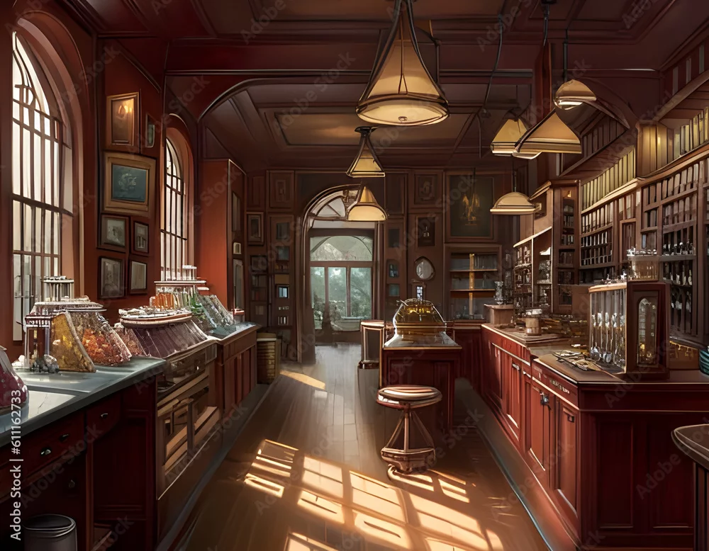the interior of an old-fashioned candy shop with sweets displayed on wooden shelves, cabinets and counters. generative ai illustration