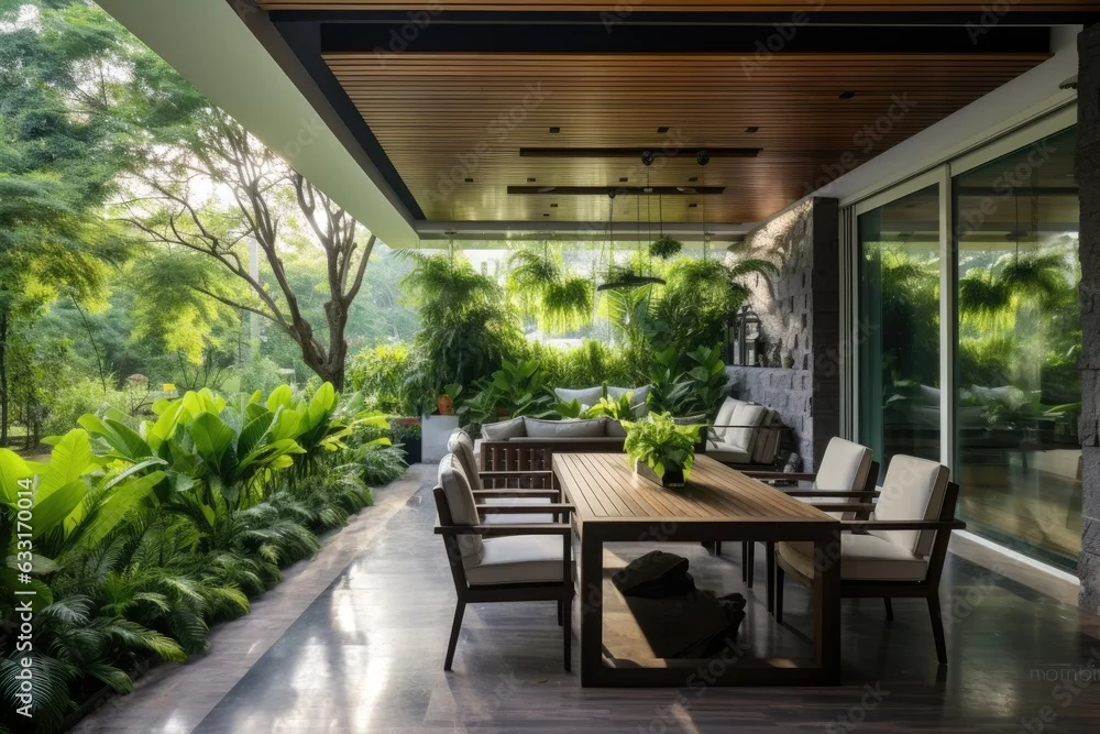 The terrace design is characterized by its pleasing and visually appealing elements, including a courtyard garden, bushes, a curtain wall, a matching set ...