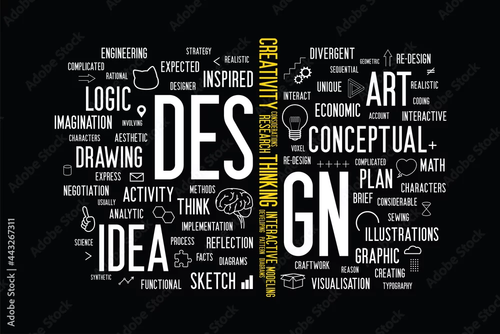 The white word “design” is separated and replaced the letter I with yellow creative words group. Flat minimal style words cloud with illustration about ...