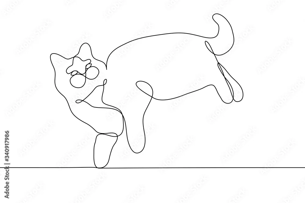 Thick fluffy cat silhouette one continuous line art on a white background. Square vector drawing of a cat lying on its side. The cat looks up, he is relaxed, he is comfortable. For animation,