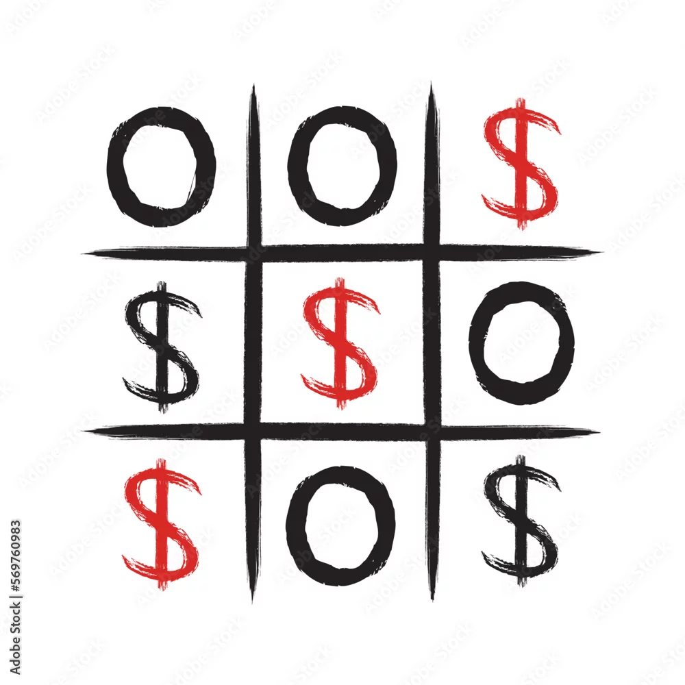 Tic-tac-toe game with dollar signs. Funny hand drawn poster for print, banners, web. Doodle design about risk management, successful and profitable business ...