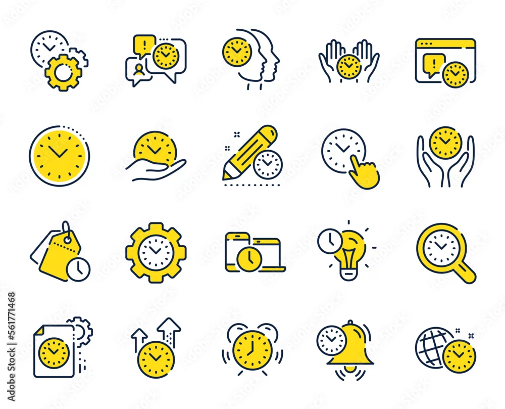 Time management line icons. Alarm clock, timer plan and project deadline signs. Countdown clock, time log and appointment reminder icons. People work, watch and office timer. Vector