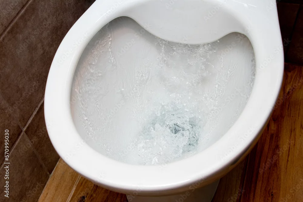 Toilet while flushing urine with water. A stream of water in the toilet bowl