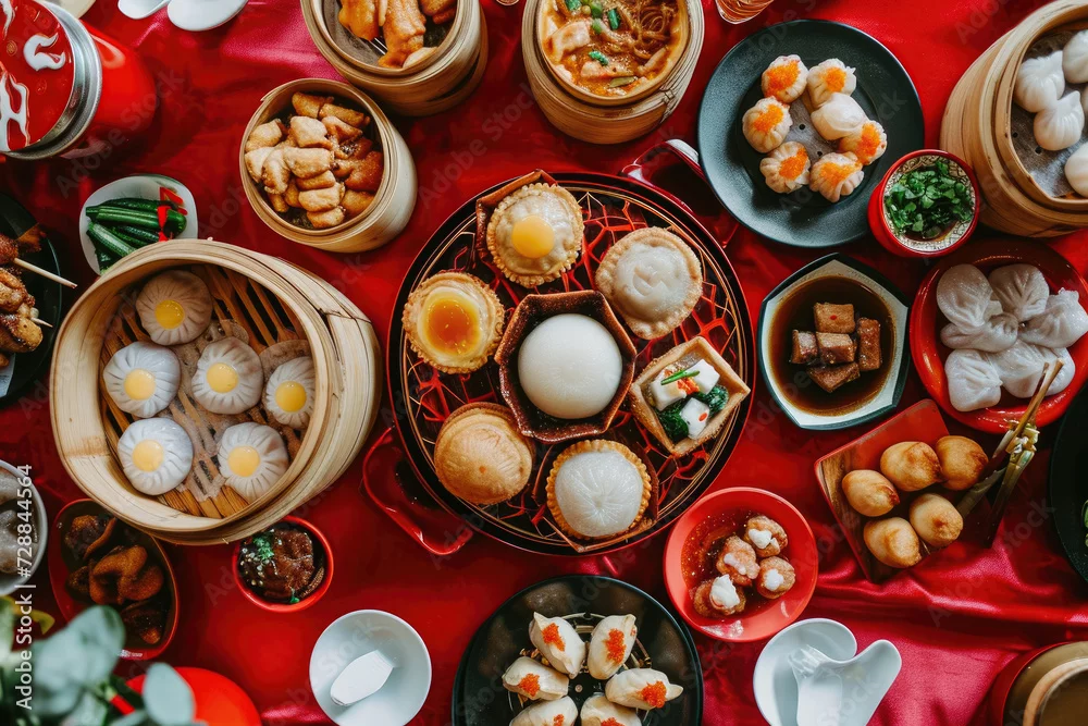 top-down shot of a table full of dim sum dishes, including har gow, siu mai, char siu bao, and egg tarts