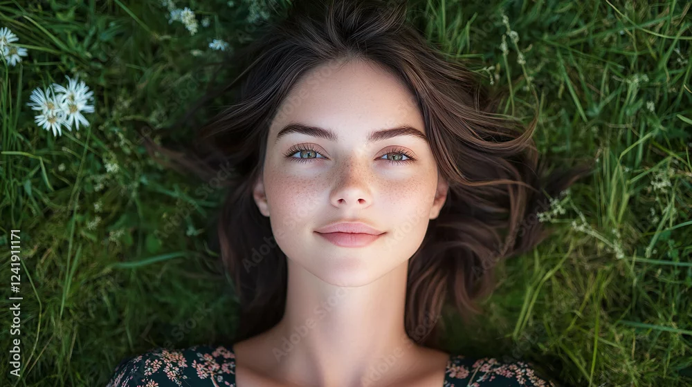 Top view of a beautiful young woman with brunette hair, lying in the grass, looking at the camera and smiling. summer outdoor leisure time and relaxation for a pretty lady, carefree female person.