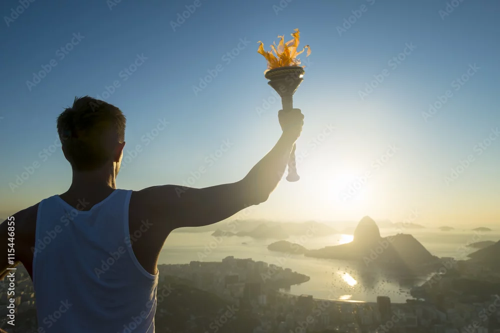 Torchbearer athlete holding sport torch standing in silhouette against the sunrise skyline of Rio de Janeiro, Brazil with Sugarloaf Mountain
