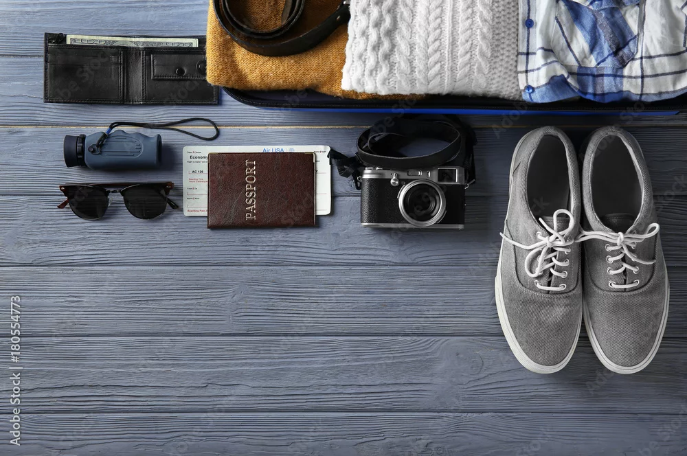 Tourist stuff on wooden background