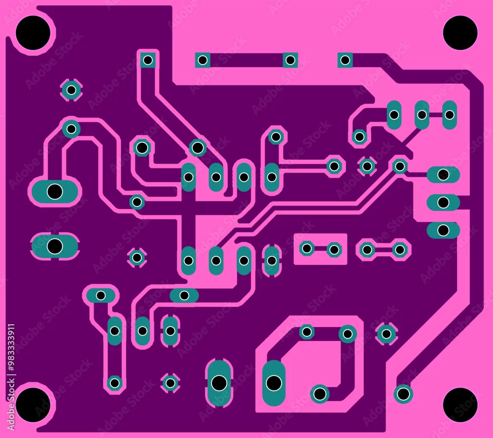 Tracing conductors of printed circuit board of electronic device. Vector engineering drawing of pcb with conductors and contact pads. Electric background. Computer ...