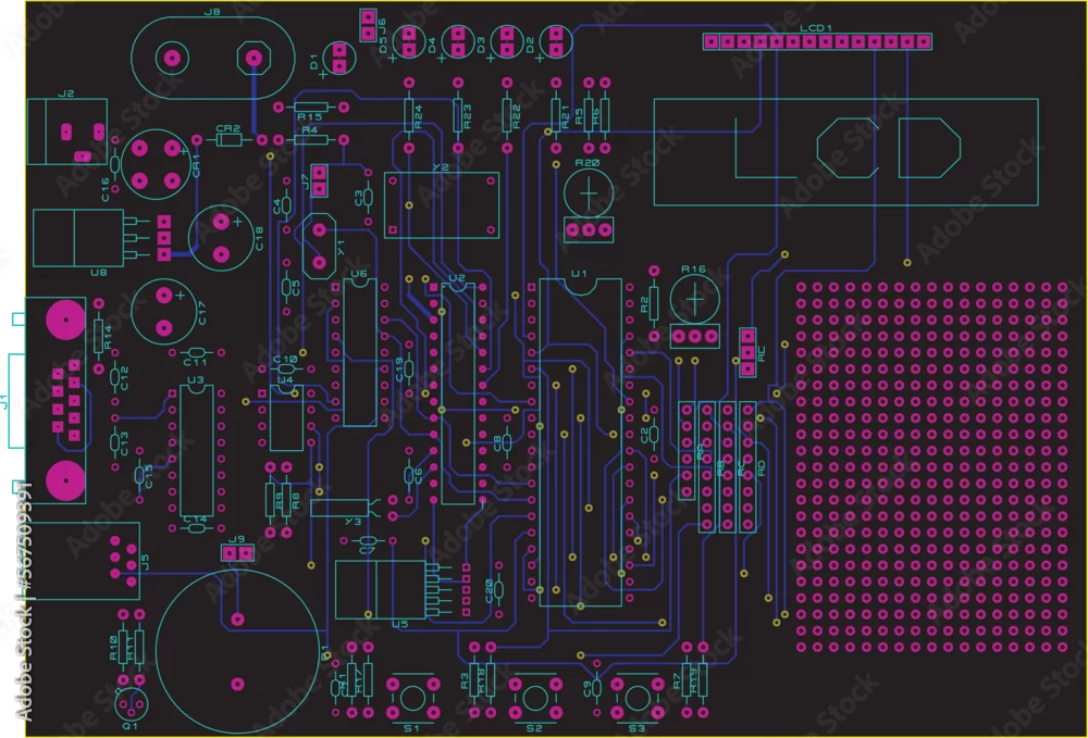 Tracing the conductors of a multilayer printed circuit board. Vector drawing of printed tracks, transition holes, contact pads and copper metallization areas. Electronic circuit board with components