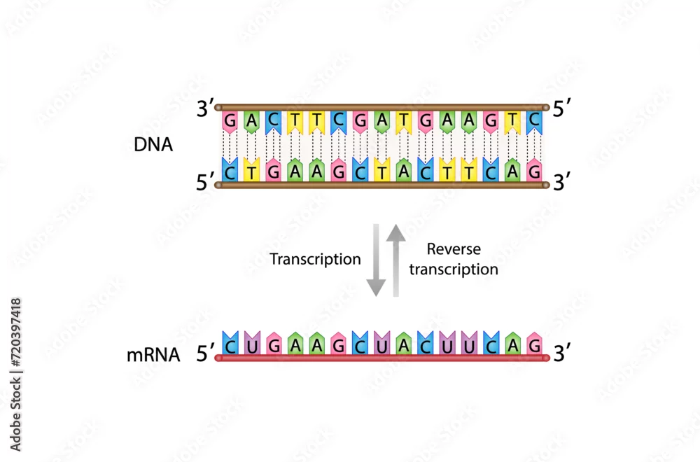 Transcription, DNA is converted into a mRNA. Reverse Transcription, mRNA is converted into a DNA. Translation, mRNA directs protein synthesis. Genetic code. Vector illustration.