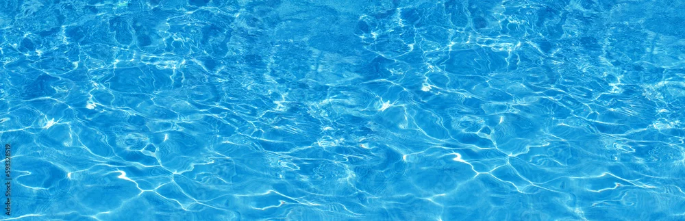 Transparent blue colored clear water surface texture with splashes. Water background, ripple and flow with waves. Blue water shinning. Sea, ocean surface. Overhead top view. Flat lay design.