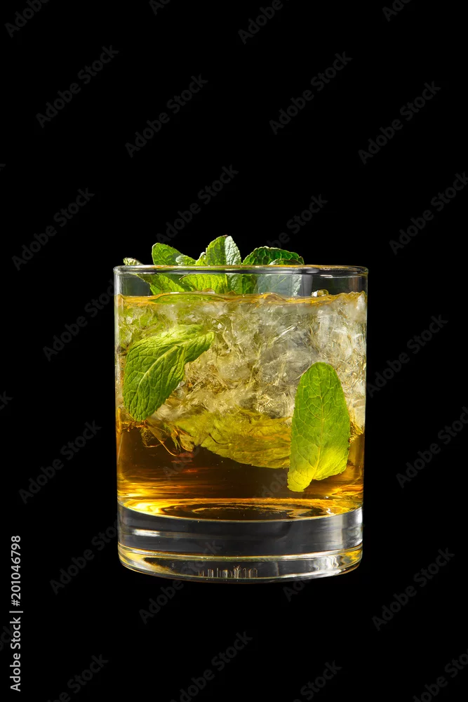 Transparent one-color cocktail in a low glass with crushed ice frappe with mint leaves with melon, pear, apple taste. Side view Isolated black background. ...