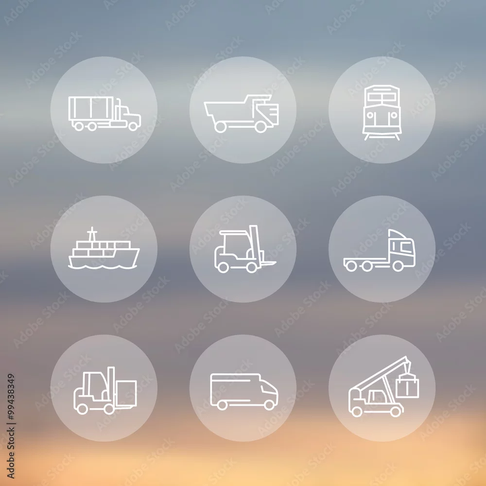 Transportation, line transparent round icons, forklift, cargo ship, freight train, kinds of transportation, mode of transport, vector