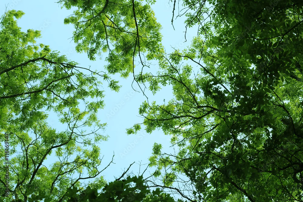 Tree leaves and branches on a sky background