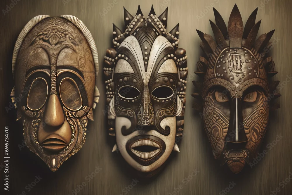 Tribal mystic African masks. Ceremonial antique cultic curved voodoo masks. Generate ai