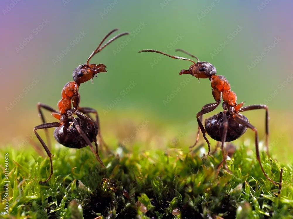 Two ants. Conflict, ants fight. Conceptually - dialogue, conversation, meeting, showdown, difficult negotiations. Beautiful rainbow background. Ants large, ...