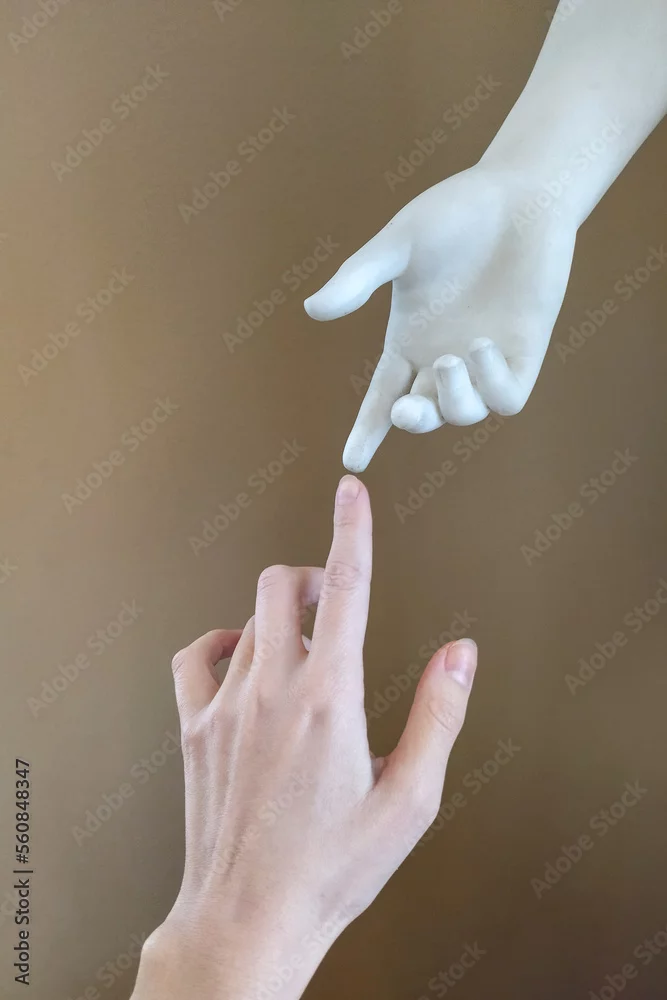 two hands, the hand of a statue and the hand of a man reaching for each other with fingers. Minimalism style. A metaphor for the creation of Adam by Michelangelo. ...