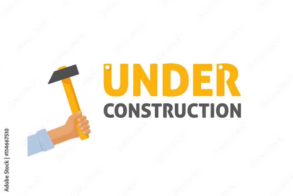 Under construction sign vector illustration, maintenance website page emblem with text, casual man hand holding hammer symbol, flat logo, poster, billboard design isolated on white background