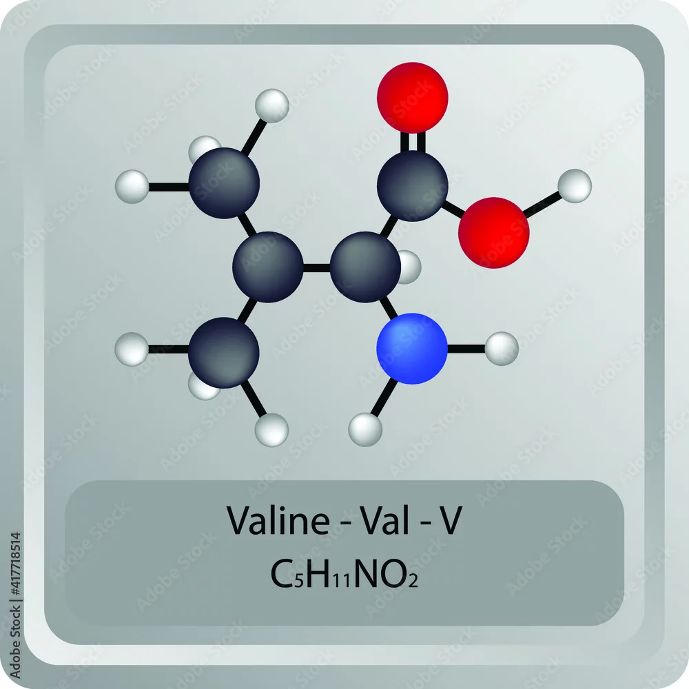 Valine - Val - V - Amino Acid chemical structure. Molecular formula ball and stick model of Histidine Molecule. Biochemistry class, Biological and Chemical ...