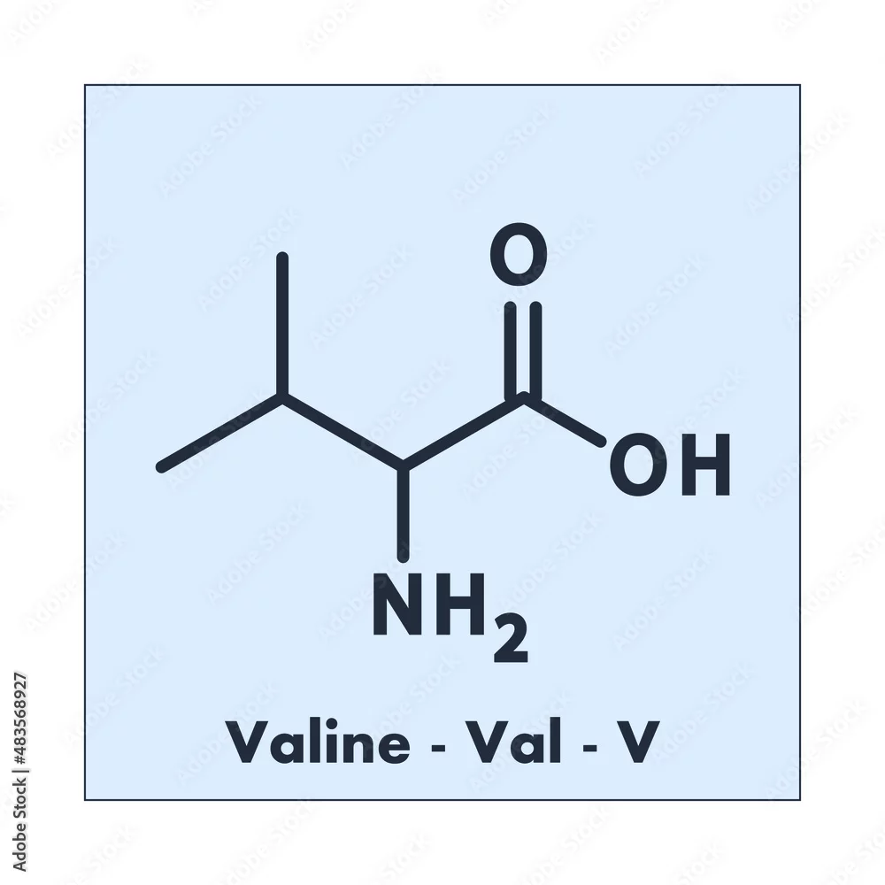 Valine - Val - V - Essential Amino Acid molecular formula, flat chemical structure on blue background for chemistry and biology education.