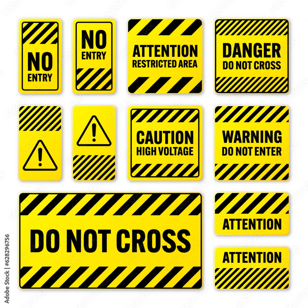 Various black and yellow warning signs with diagonal lines. Attention, danger or caution sign, construction site signage. Realistic notice signboard, warning ...