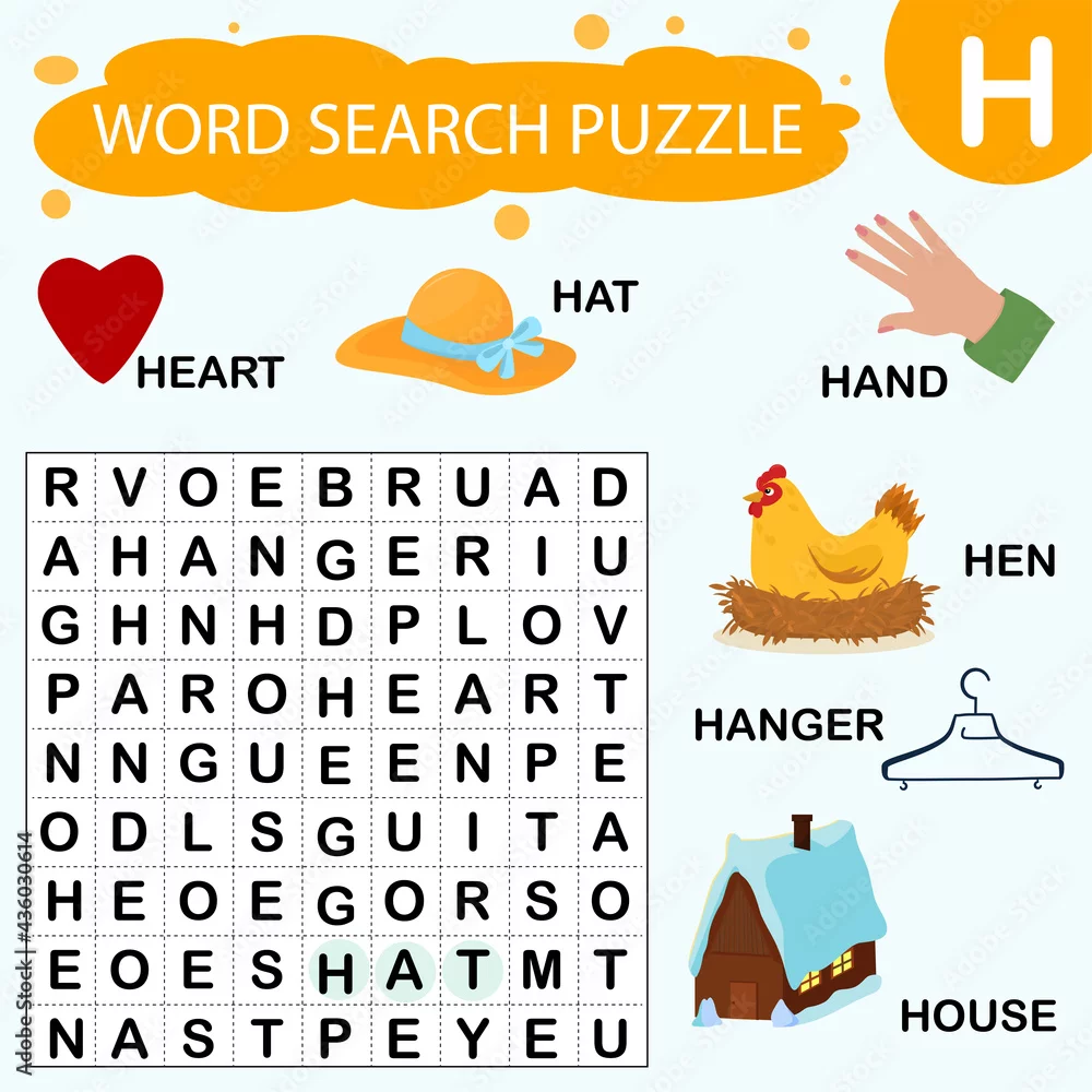 Vector educational game for kids. A puzzle for finding words starting with the letter H