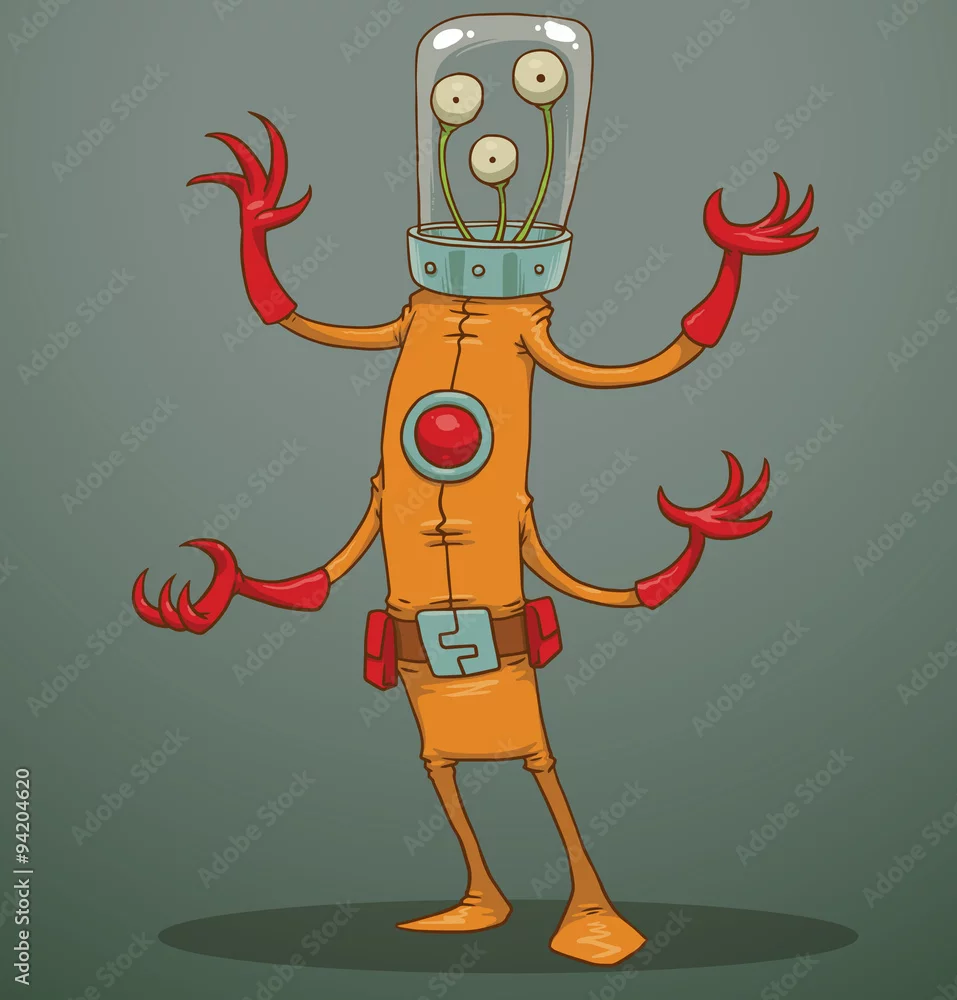 Vector funny alien with four arms. Cartoon image of a funny alien green color with three eyes, four arms and two legs dressed in an orange spacesuit on ...