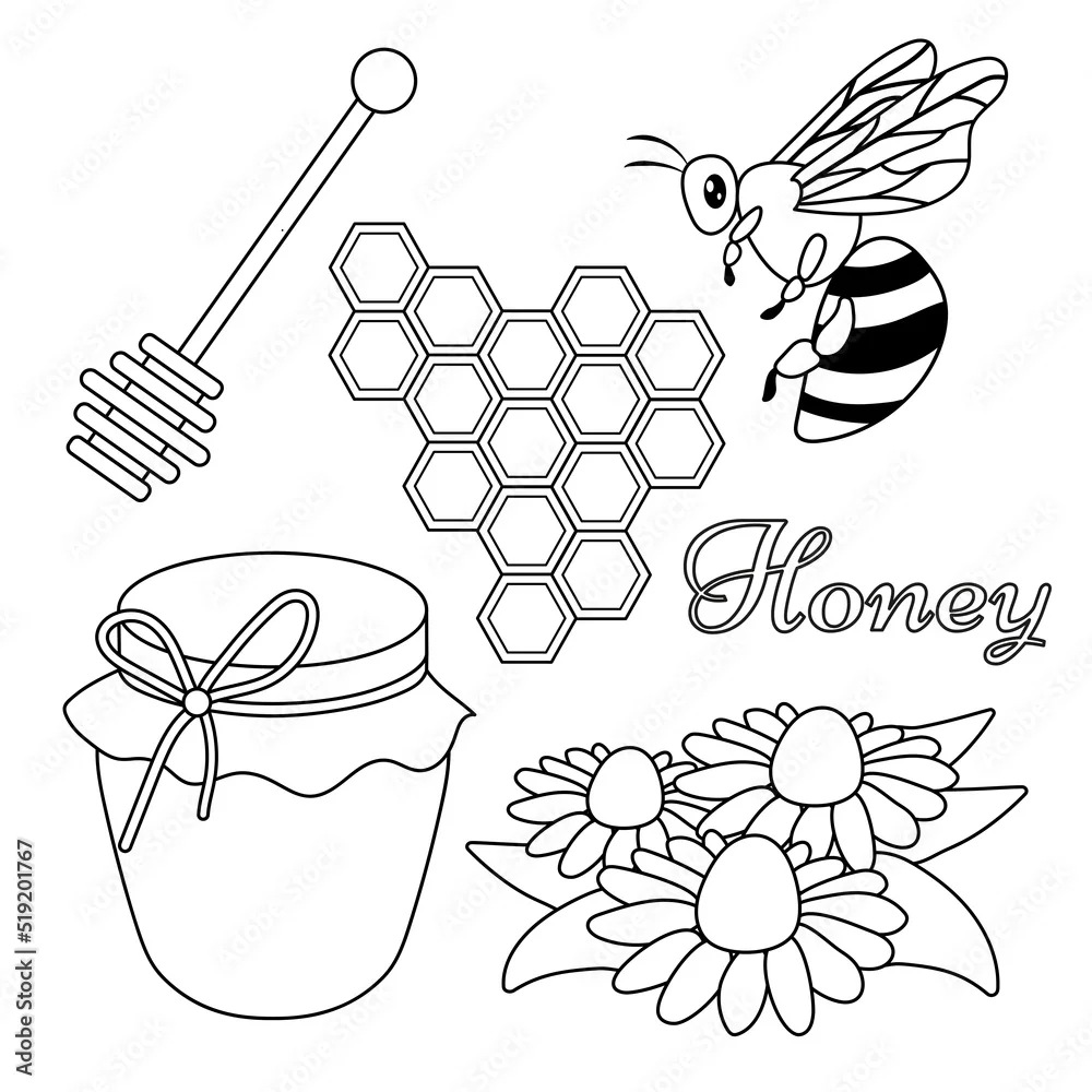 Vector honey element doodle set with honey, honeycomb, flying bee, chamomile flowers, flowing liquid on a stick, Honey Jar. Organic Products for Logo. ...