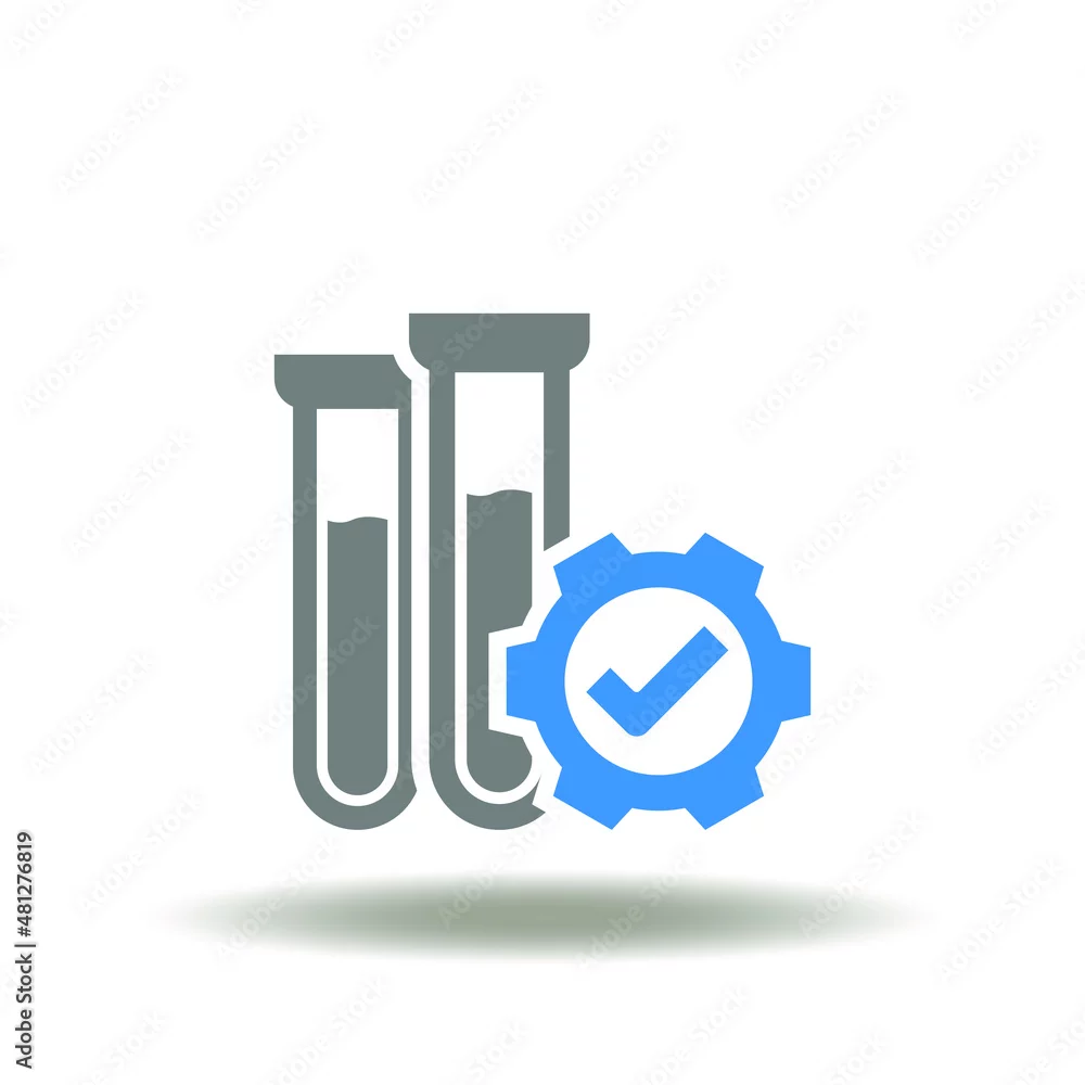 Vector illustration of test tube with gear and check mark. Icon of medical lab test. Symbol of laboratory chemical tests.