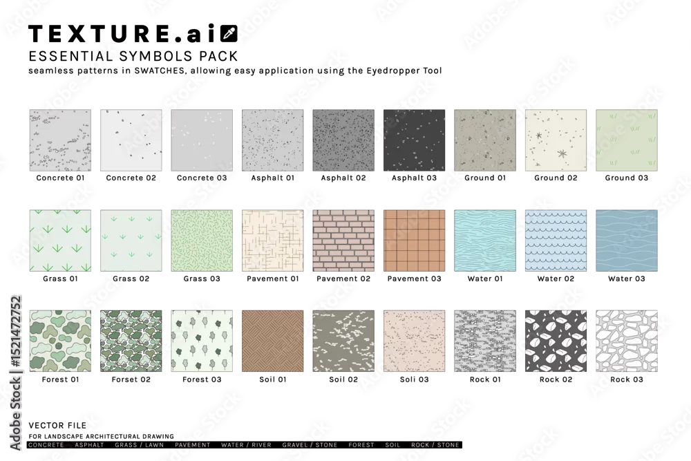 Vector pattern texture cad set for landscape architecture. Includes concrete, asphalt, grass, pavement, water, gravel, soil, forest, and stone surfaces. color