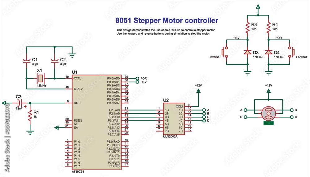 Vector schematic diagram of an electronic device. Design demonstrates the use of a microcontroller to control a stepper motor. Electric scheme on the ...