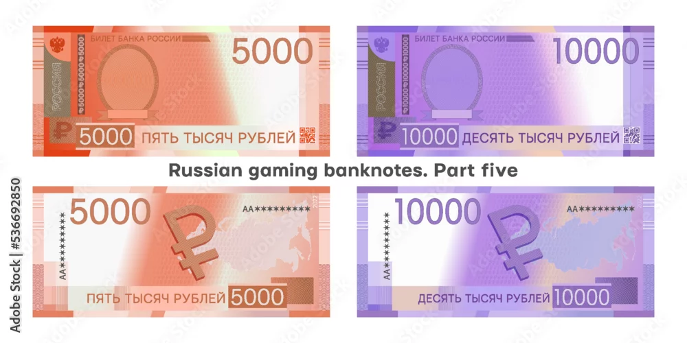 Vector set of banknotes. In Russian, it is written on top - a ticket of the Bank of Russia, along the vertical - Russia, below 5000, 10000 rubles. Game money of the RF. QR code stands for 5000, 10000