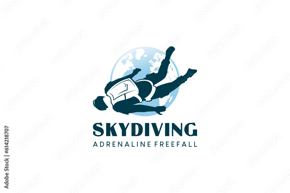 Vector silhouette of person in free fall with globe background, skydiving sport logo design