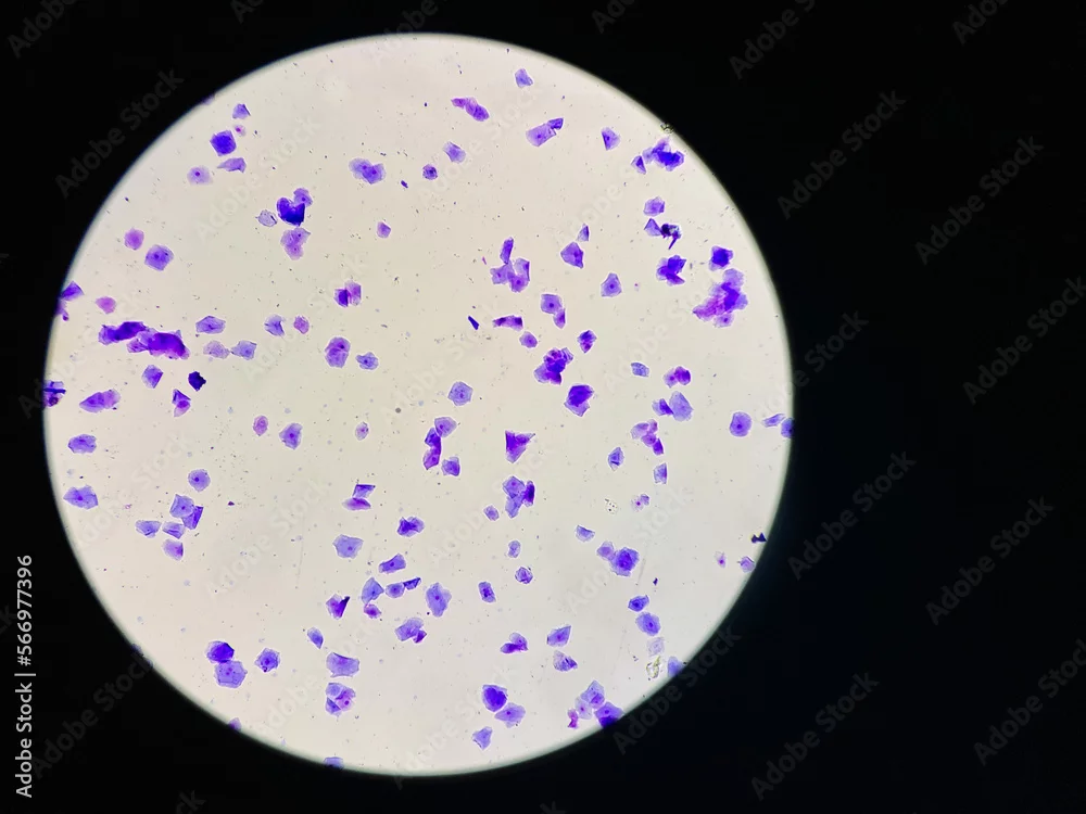 View in microscopic of dog vaginal smear cells.Squamous epithelium cells.Superficial and intermediate epithelial cells.