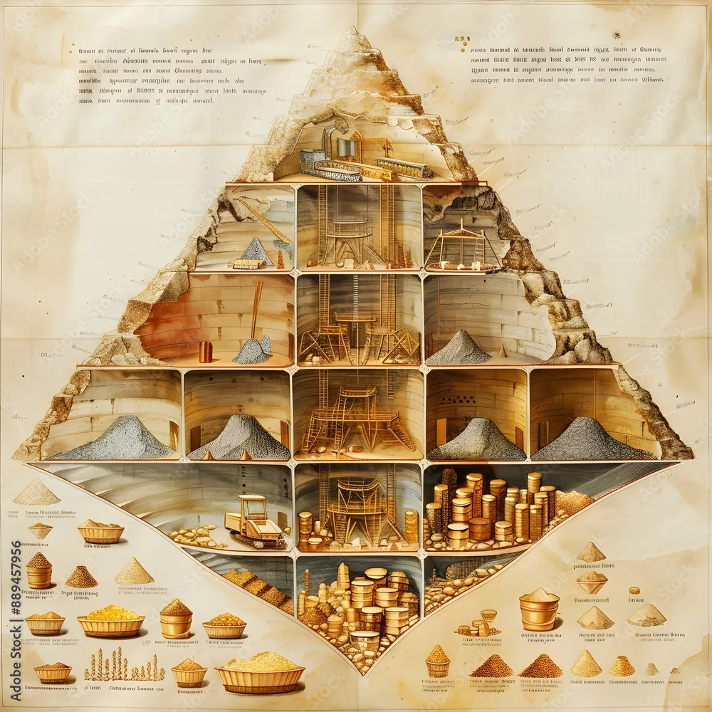 Vintage Funnel Chart Depicting Gold Production Process from Mining to Market