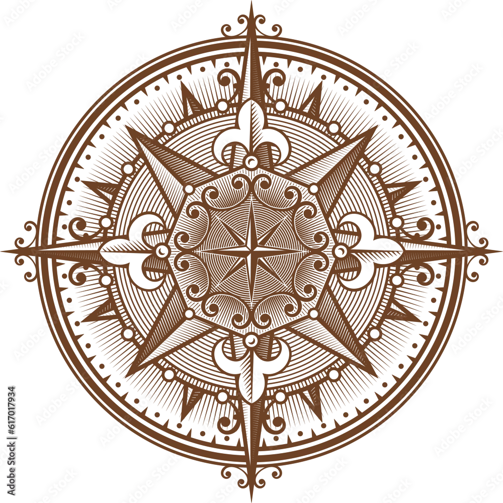 Vintage Medieval antique wind rose compass with arrows on star, vector old navigation symbol. Retro marine map, ancient cartography and sail navigation symbol of wind rose compass in woodcut hatching