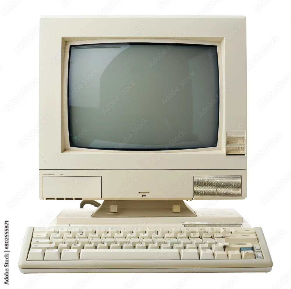 Vintage personal computer with keyboard from the 1980s isolated on transparent background