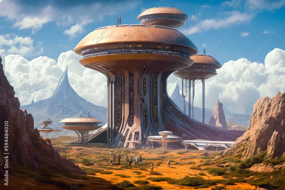 Vintage pulp sci fi art, geometric science fiction futuristic architecture, exterior building design, concept art. Generative AI