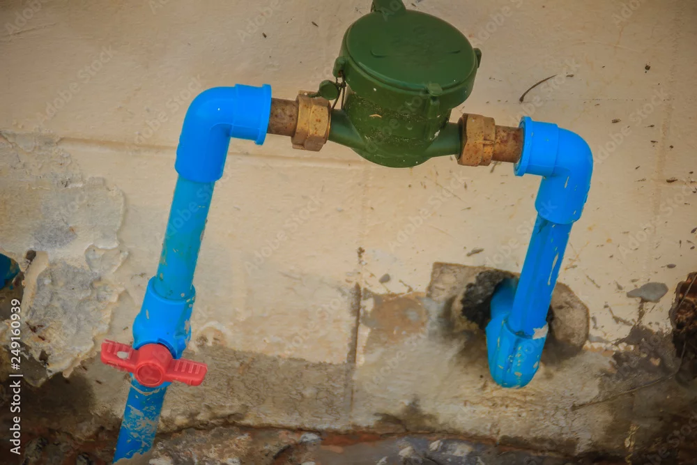 Vintage water meter installed with bronze joint, PVC elbow connector, blue PVC pipe and red water valve on the grungy wall.