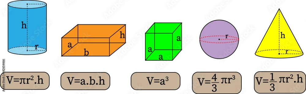 Volume Formulas for Geometric Shapes ,3D shapes.Vector illustration