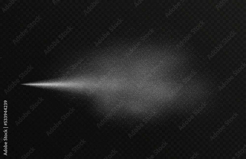 Water spray effect, realistic cosmetic mist, transparent atomizer splash. White fragrance aerosol texture, abstract cosmetic haze isolated on black. Vector ...
