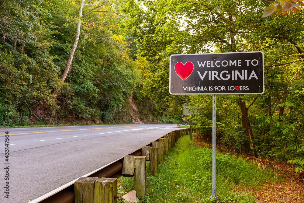 Welcome to Virginia sign located at the Maryland, Virginia state border at Purcellville, Virginia. The black sign has a red heart shape and 'Virginia is for lovers' slogan underneath.